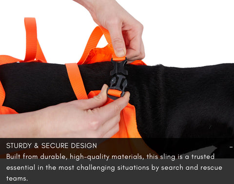 Ofurléttur björgunar burðarpoki sem björgunarsérfræðingar treysta. Burðarpokinn aðstoðar þig að bera hundinn þinn á öruggan máta ef óvænt meiðsli breyta gönguferðinni í neyðarástand. Nauðsynlegur hluti af skyndihjálparpakka hundsins!